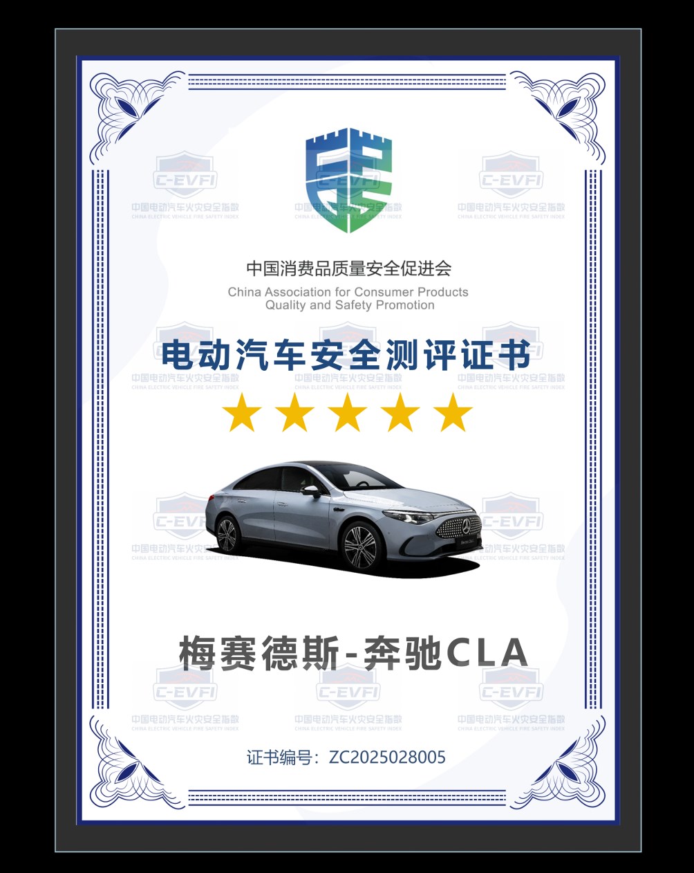 全新純電長軸距CLA采用多級高壓安全理念,在碰撞時車輛的高壓系統(tǒng)可以自動關(guān)閉,電池包毫秒級切斷高壓響應,2秒內(nèi)電壓歸零。日前,全新純電長軸距CLA通過了中國電動汽車火災安全指數(shù)的測評,獲得五星安全認證:在第三方測試中,在單個電芯熱失控后,整車未起火、未爆炸,動力電池熱穩(wěn)定性滿足2026年生效的新國標的要求。