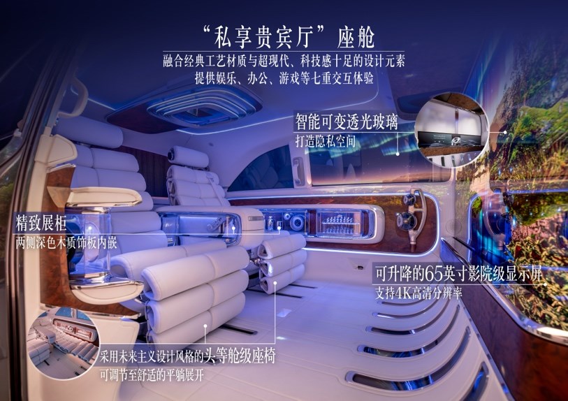 Vision V概念車開啟個(gè)性化數(shù)字豪華的全新維度。帶分屏功能的65英寸影院級(jí)顯示屏可自如升降,以4K超清畫質(zhì)呈現(xiàn)震撼視覺效果。7臺(tái)投影儀集成于車頂及地板,側(cè)窗更化身為輔助“屏幕”,構(gòu)建360度全景體驗(yàn)。帶杜比全景聲的環(huán)繞立體聲音響系統(tǒng)配備42個(gè)揚(yáng)聲器,包含座椅內(nèi)的振蕩器。如繭房般全方位環(huán)繞感官的數(shù)字體驗(yàn),為乘客構(gòu)建七重交互體驗(yàn)世界——娛樂、放松、游戲、辦公、購(gòu)物、探索及卡拉OK,讓座艙可化身為“移動(dòng)影院”、“移動(dòng)電競(jìng)艙”、“移動(dòng)音樂廳”、“移動(dòng)辦公室”或放松身心的“移動(dòng)綠洲”。