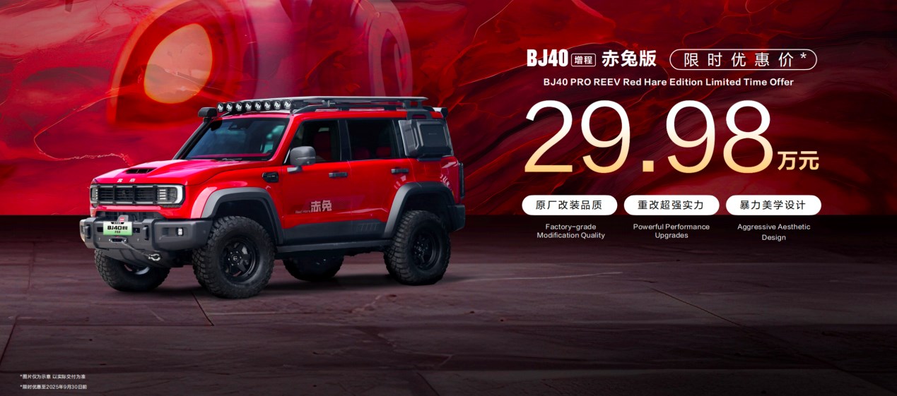 上市以來,BJ40增程進階版訂單比例超過75%。北京越野董事長王昊宣布,BJ40增程赤兔版正式發(fā)布,實現(xiàn)顏值、性能、安全三大升級,大幅提升整車視覺沖擊力、越野性能以及安全防護,改裝提升項價值超20萬元,限時優(yōu)惠價為29.98萬元(截止至9月30日),即刻可在“悅野圈APP”下單預存2000元創(chuàng)始基金,預計今年四季度正式交付。