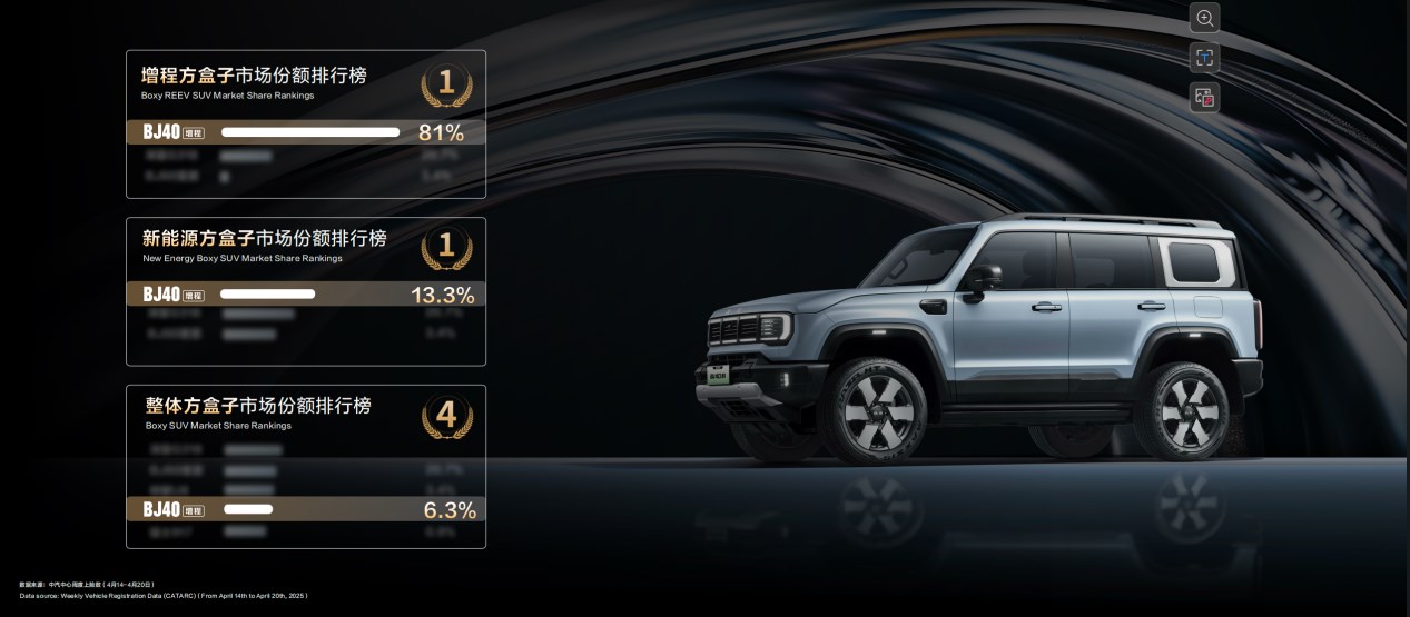 BJ40增程既能城市通勤非常省油、又能周末戶外肆意馳騁,發(fā)布會后1小時訂單量就突破了3000臺,48小時突破了1萬臺。根據(jù)中汽中心周度上險數(shù)顯示,在增程方盒子排行榜上,BJ40增程上周市場份額達到81%;在新能源方盒子市場,排名第一;在整體方盒子市場中,排名第四。這是用戶對北京越野“做增程方盒子之王”的信任投票。