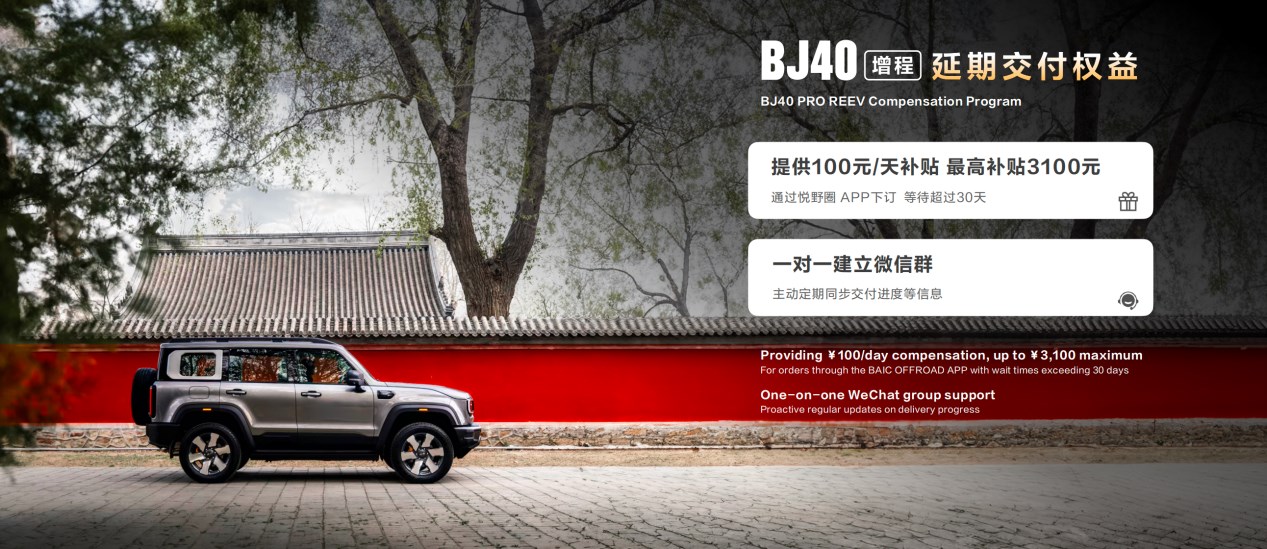短時間大量訂單涌入,市場上存在部分車輛訂單延遲交付。北京越野發(fā)布“BJ40增程延期交付權益”,用戶在悅野圈 APP 下訂后,車輛等待時間超過 30 天后給予 100 元/天補貼,最高補貼 3100 元,補貼將在悅野圈 APP 以“積分”形式兌現(xiàn)給用戶。同時,北京越野將與用戶一對一建立微信群,主動定期同步車輛生產(chǎn)下線進度、物流發(fā)運進度及預計交車時間等,讓用戶的期待離實現(xiàn)越來越近。