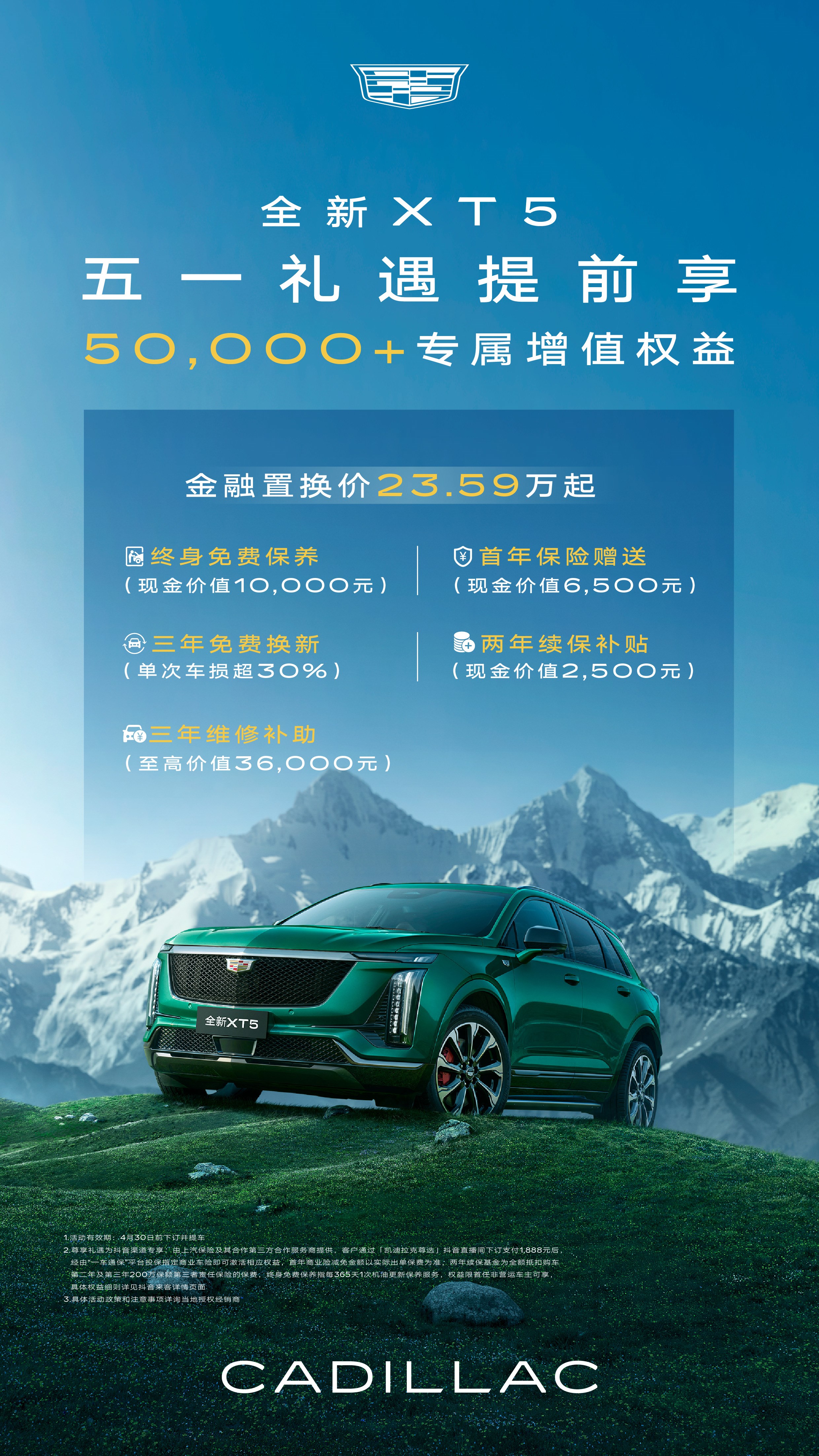 (2025年4月24日)今日,凱迪拉克品牌宣布,全新XT5春日煥季版正式上市,限時全款一口價26.59萬元起,購車即可尊享春日煥季限定色——墨脫綠。同時,全新XT5春日煥季版將延續(xù)23.59萬起金融置換價,還可“五一禮遇提前享”,包含終身免保養(yǎng)、首年保險贈送、三年免費換新等在內(nèi),價值超50,000元的專屬增值權(quán)益,讓消費者擁車終身無憂,暢享全路況自由。