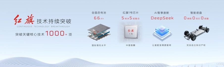 自2023年全面、全方位、全體系向智能網(wǎng)聯(lián)新能源汽車轉(zhuǎn)型以來,紅旗品牌緊緊圍繞國家所需、產(chǎn)業(yè)所急、用戶所想聚力攻堅,突破關(guān)鍵核心技術(shù)1000余項,已經(jīng)完成66Ah全固態(tài)電芯試制及驗證,主要指標國際領(lǐng)先;推出中國首顆車規(guī)級、5納米五域融合芯片——“紅旗1號”;引入DeepSeek等大模型技術(shù),打造智慧場景大腦;同時研發(fā)了擁有完全自主知識產(chǎn)權(quán)的全主動智能底盤。通過一系列技術(shù)的創(chuàng)新應(yīng)用,紅旗品牌打造了“天工”純電、“鴻鵠”混動、“九章”智能三大技術(shù)平臺,為紅旗品牌的持續(xù)躍遷打牢了堅實技術(shù)底座。